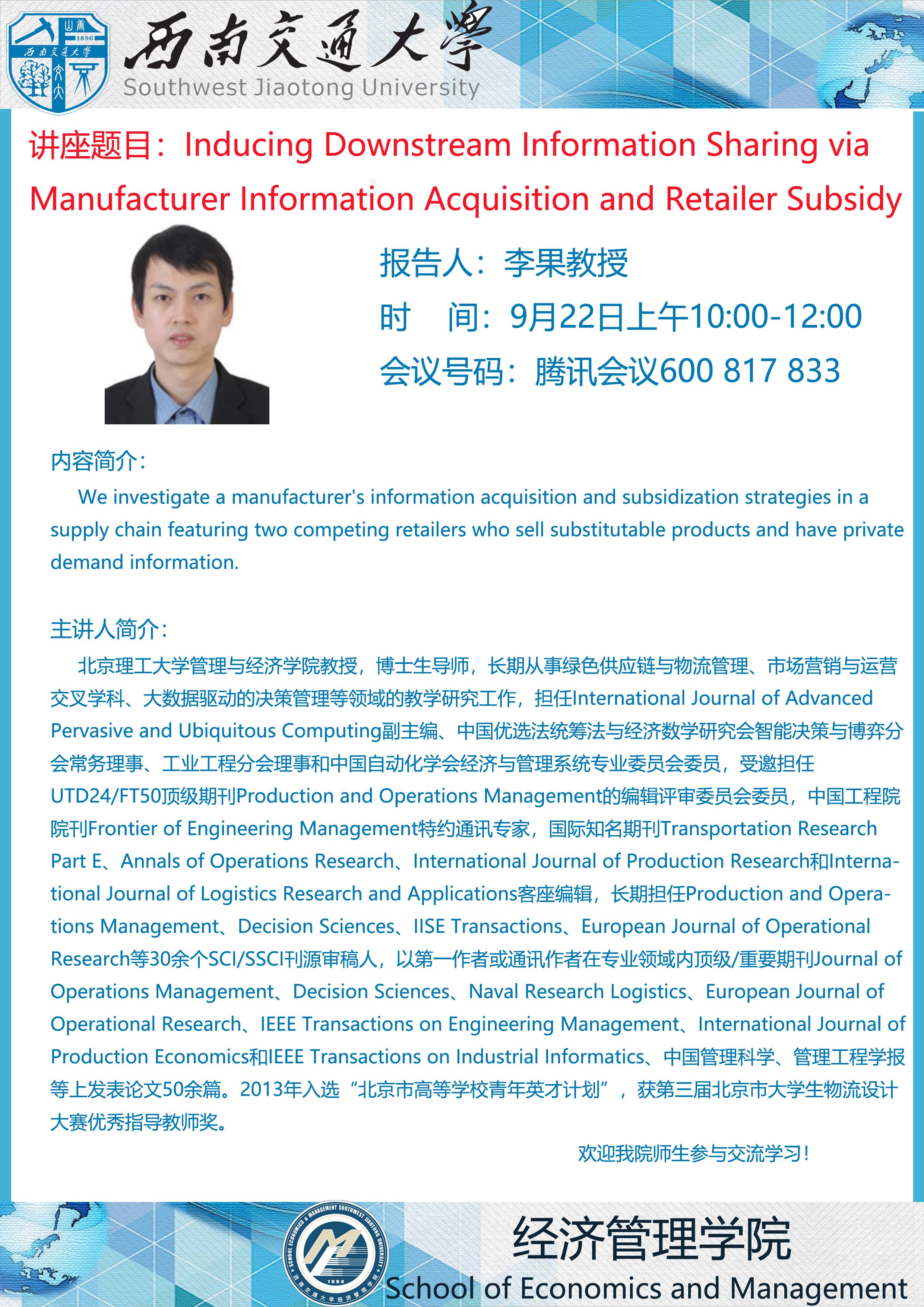 北京理工大学管理与经济学院李果教授学术讲座