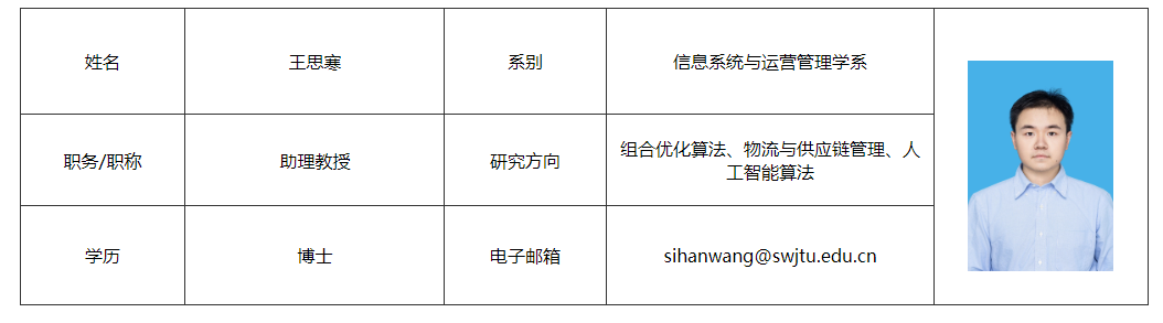 主要研究方向为组合优化算法、物流与供应链管理、人工智能算法等。在Transportation Science、Transportation Research Part B: Methodological、Computers & Industrial Engineering等国际顶级和知名期刊发表论文3篇。参与国家自然科学基金面上项目等多项课题。