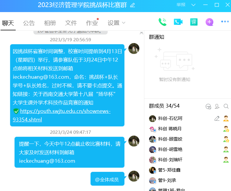自2023年2月,各学院、各级团组织以多种形式进行广泛的宣传动员。在校团委和学院的通力配合下,经管学院师生充分了解了竞赛内容及总体安排。同时,学院团委通过建立挑战杯比赛QQ群的方式积极组织学院队伍参加比赛。各参赛队在老师指导下完成了申报作品,并完成了作品的提交。开云官网于四月初顺利收集各报名参赛队伍的材料。后续将结合实际情况统筹开展遴选,推荐优秀项目参加校赛,希望各报名队伍认真准备比赛,同时预祝选手们在比赛中取得理想的成绩!