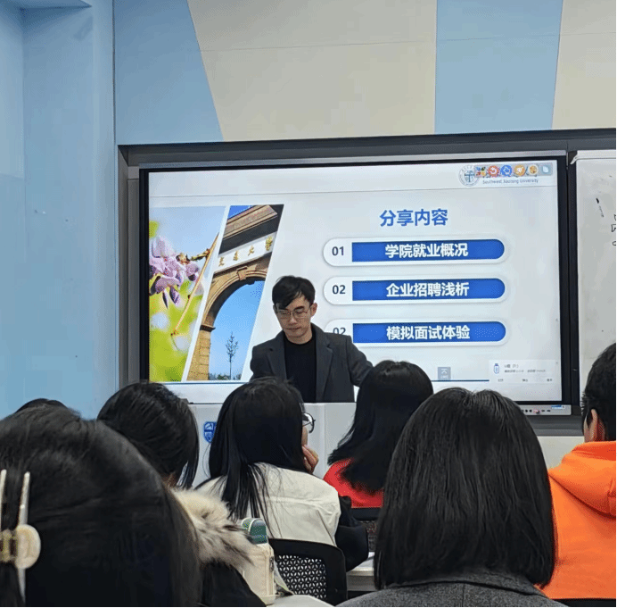 整个就业指导工作坊分为三个板块,包括学院就业概况、企业招聘浅析以及模拟面试体验。在学院就业概况板块,苏扬老师向同学们展示了2023届本科毕业生的毕业去向,有保研考研的学长学姐,也有收到了就业和留学offer的学长学姐。在了解了就业概况后,同学们对于自己未来的方向有了一个更加清晰的认识。
