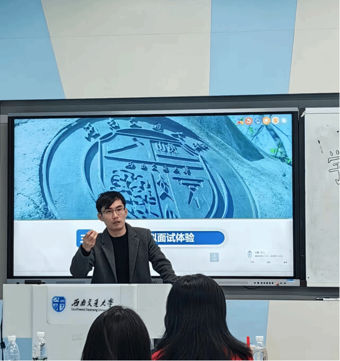 在最后一个板块,苏扬老师先是为同学们讲解了面试能力的重要性,教导同学们如何去全面地回答HR的问题。之后苏扬老师现场扮演HR,对同学们提出了一系列的问题,同学们也积极地回答,将自己的第一想法说了出来。最后苏扬老师为同学们指出了回答中的欠缺之处,从语言表达等方面为同学们进行更深入地指导。