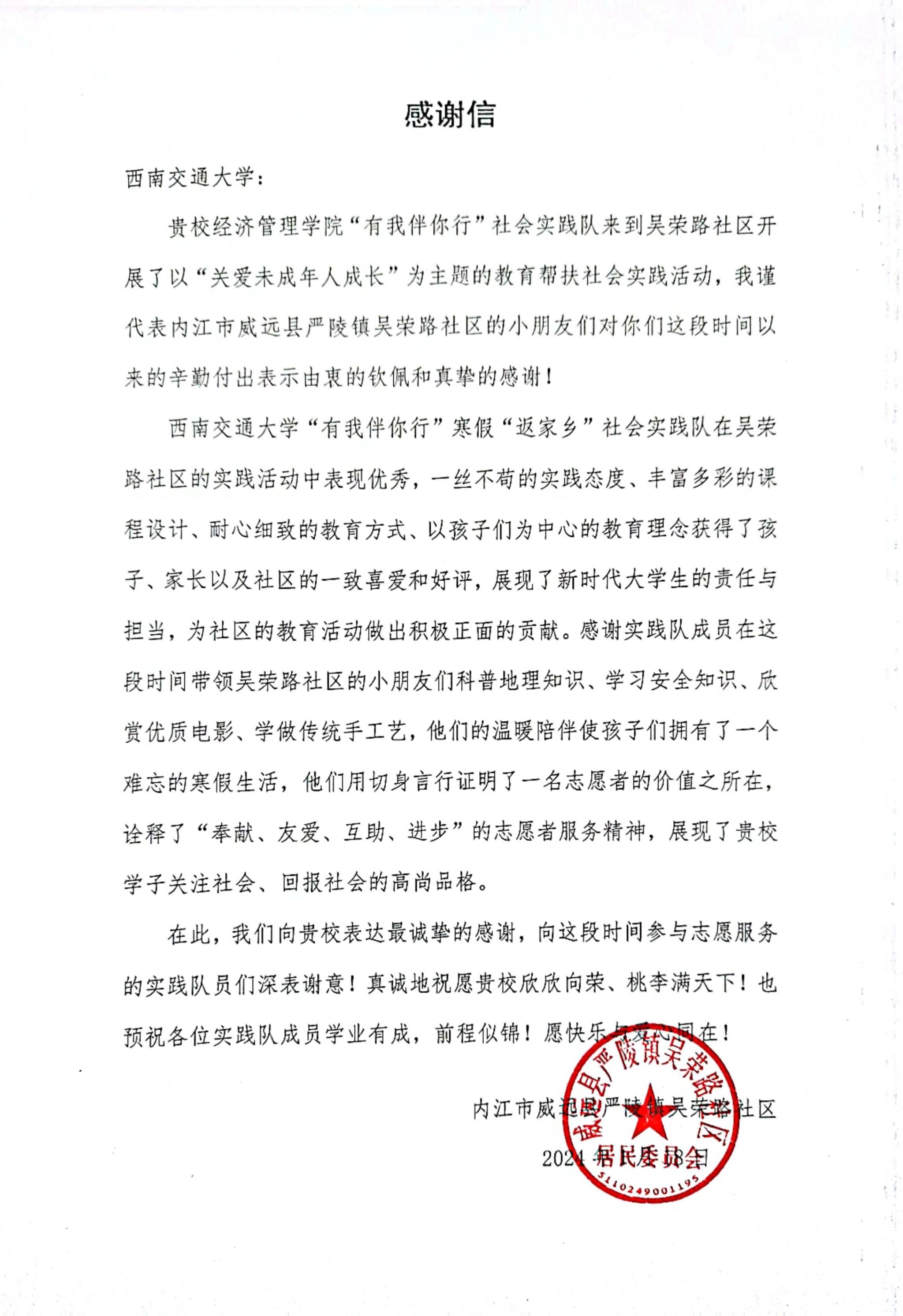 社会实践活动已圆满落下帷幕,但经管学子参与志愿服务、为社会贡献力量的脚步却从未停歇。通过本次社会实践活动,孩子们在丰富的课程中拓宽了课余知识,培养锻炼了动手实践能力,收获了安全、愉快、充实的假期生活;实践队队员们也通过课程活动拉近了与孩子们的距离,真正做到了暖心陪伴,以青春力量赋能乡村振兴。活动结束后,实践团队收到了来自吴荣路社区的感谢信。