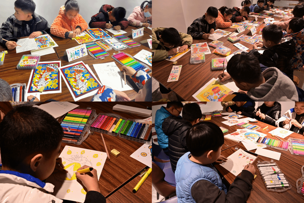 实践活动的第一天,实践队员们便与孩子们共同完成了一堂欢乐有趣且意义非凡的绘画课。实践队员向孩子们传授了春节的起源和有关的习俗,带领他们一起朗诵古诗词,感受了浓厚的新春文化氛围。同学们在实践队成员的帮助下,在创作过程中认真观察,大胆想象,设计出自己喜爱的图案,最终创作出了以春节为主题,充满节日氛围的作品。绘画活动培养了孩子们的创造力,拓展了孩子们的艺术思维,同时也让孩子们在潜移默化中将传统节日、传统习俗等优秀中华传统文化根植于心。