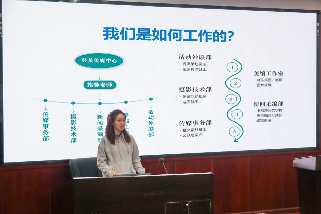 经英传媒中心指导老师王重月及主席张天润分别从不同方面对经英传媒中心全体成员进行了集体培训。张天润详细介绍了经传组织结构、工作特色、所获成绩,让新加入的伙伴们再次加深对学院宣传工作的认知。王重月则主要对经英传媒中心应该“如何高效、高质量开展工作”进行了讲解,在详细介绍了五个部门各自的职能后,指出了整个组织不仅需要部门各司其职,更需要共同合作,才能延续属于经英传媒中心的辉煌。