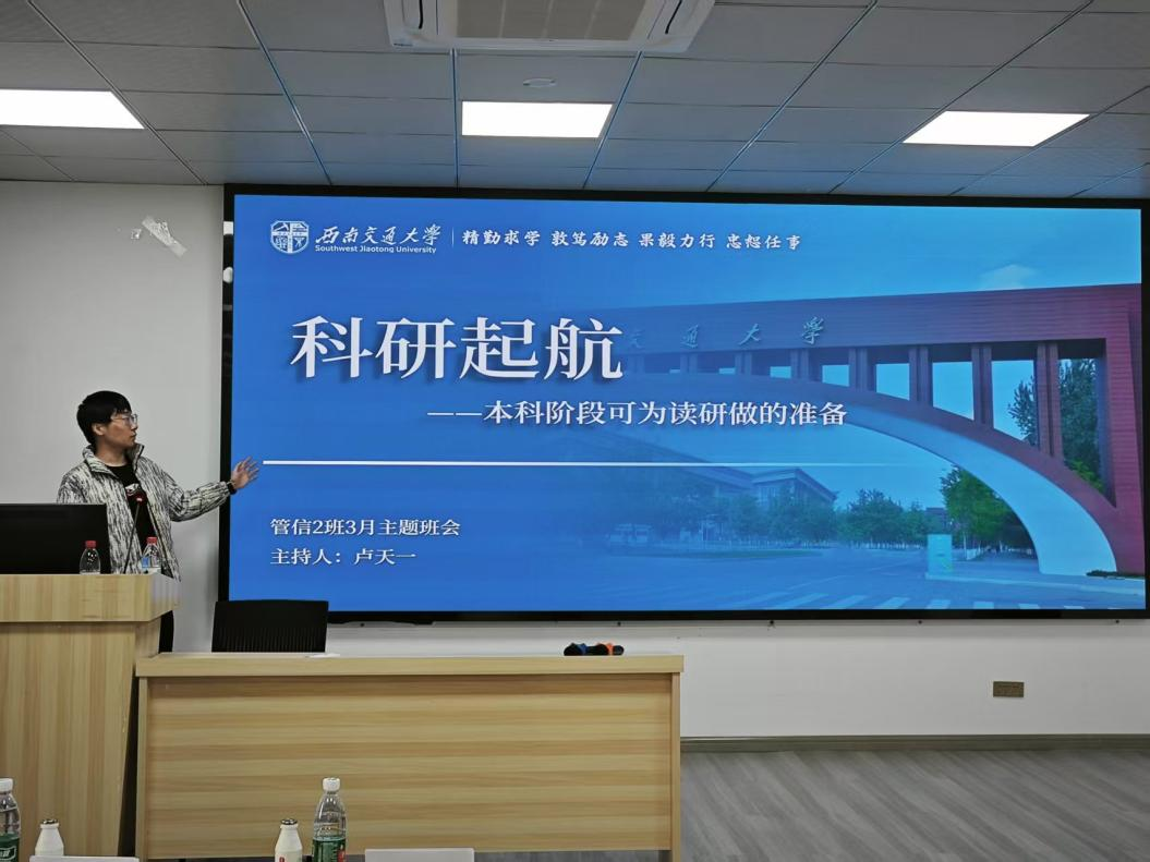2025年3月13日晚,开云kaiyun官网本科2023级管信2班“科研起步”主题班会在J0819正式开展。参加本次班级见面会的嘉宾有班导师杨斐老师和2022级会计学专业柯梦清学姐。本次主题班会分为以下4个板块:班级建设概况、守护安全与健康、科研起步知识分享、总结与展望。本次班会由班长卢天一主持。