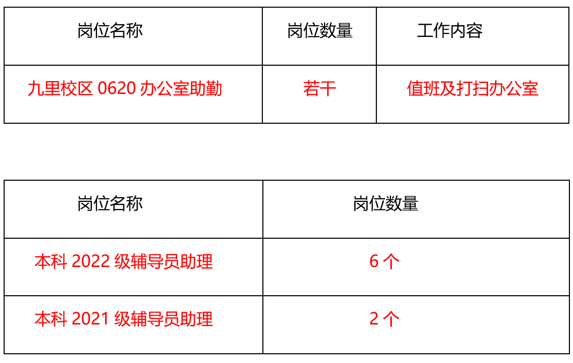 2.2022级辅导员助理面向2022级同学招聘,2021级辅导员助理和0620办公室助勤面向所有同学招聘。