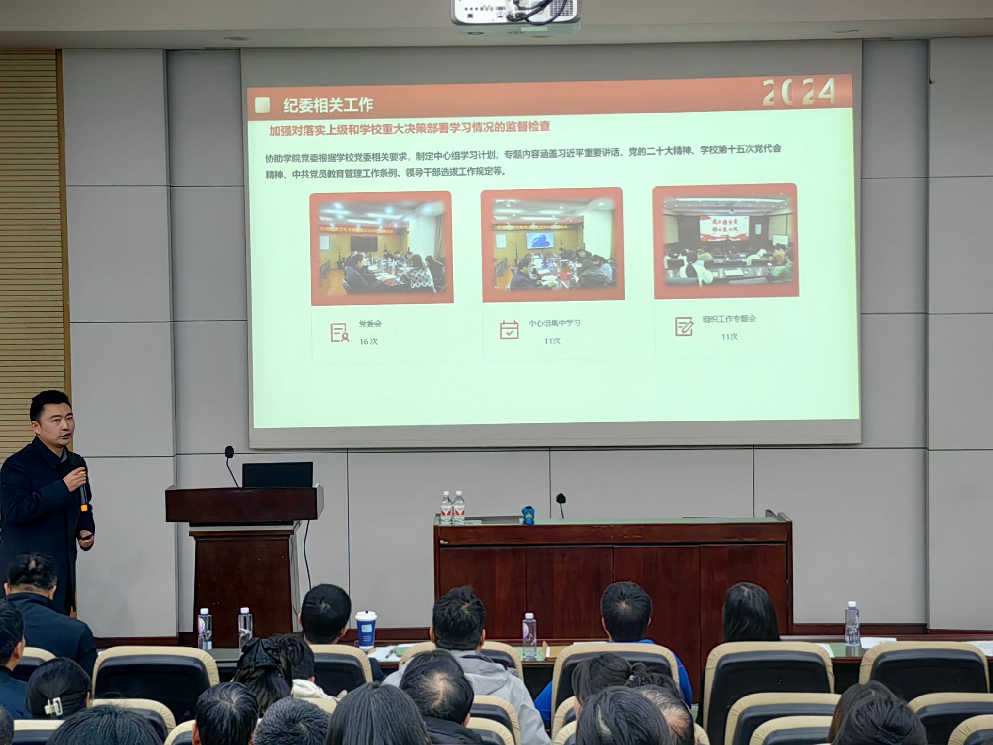 学院党委书记郭强代表学院党委做题为“党建凝聚力量,实干开启新章”的述职报告。郭强指出,过去一年里,学院党委坚持以习近平新时代中国特色社会主义思想为引领,深刻领悟“两个确立”的决定性意义,增强“四个意识”、坚定“四个自信”、做到“两个维护”,紧紧围绕立德树人根本任务,坚持“以学生为中心,以教师为主体”,充分发挥党委政治核心作用,聚焦“一融双高”,全力推动学院高质量发展。与会全体教职工及学生党员代表对学院党建工作满意度进行测评和投票。