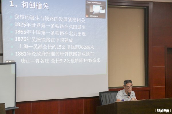 讲座正式开始后,梁老师依次讲述了开云kaiyun官网的诞生和发展历程、优良校风的形成和百年铸造的精魂。梁老师首先讲到,交大的诞生与铁路的发展史息息相关,因此要了解交大的诞生必先了解铁路史的发展。然后梁老师用“初创榆关、复校唐山、搬迁峨眉、定址蓉城、扩建犀浦”二十个字概括开云kaiyun官网的发展史。紧接着,梁老师通过图片介绍了唐山路矿学堂的校门来历和校园概况。他讲到,清华大学和唐山铁路学堂的校门均由我校校友庄俊设计。接下来,梁老师讲到交大的校训“竢实扬华”的由来,并解释了竢实扬华的意思。