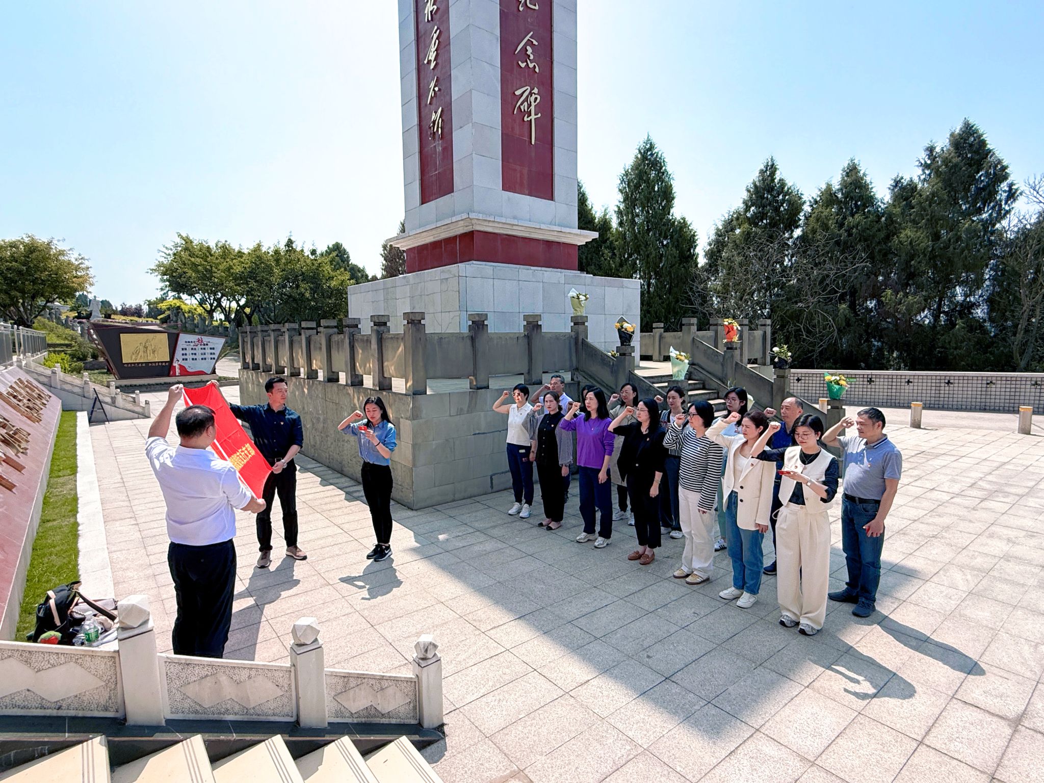 当日上午,双方党员怀着崇敬的心情前往简阳烈士陵园。烈士陵园内,松柏苍翠,庄严肃穆,革命烈士纪念碑巍然耸立,仿佛在诉说着那段波澜壮阔的革命历史。在纪念碑前,全体党员整齐列队,神情庄重,重温入党誓词,并向革命先烈鞠躬默哀、敬献鲜花,表达对先烈们的深切缅怀和崇高敬意。