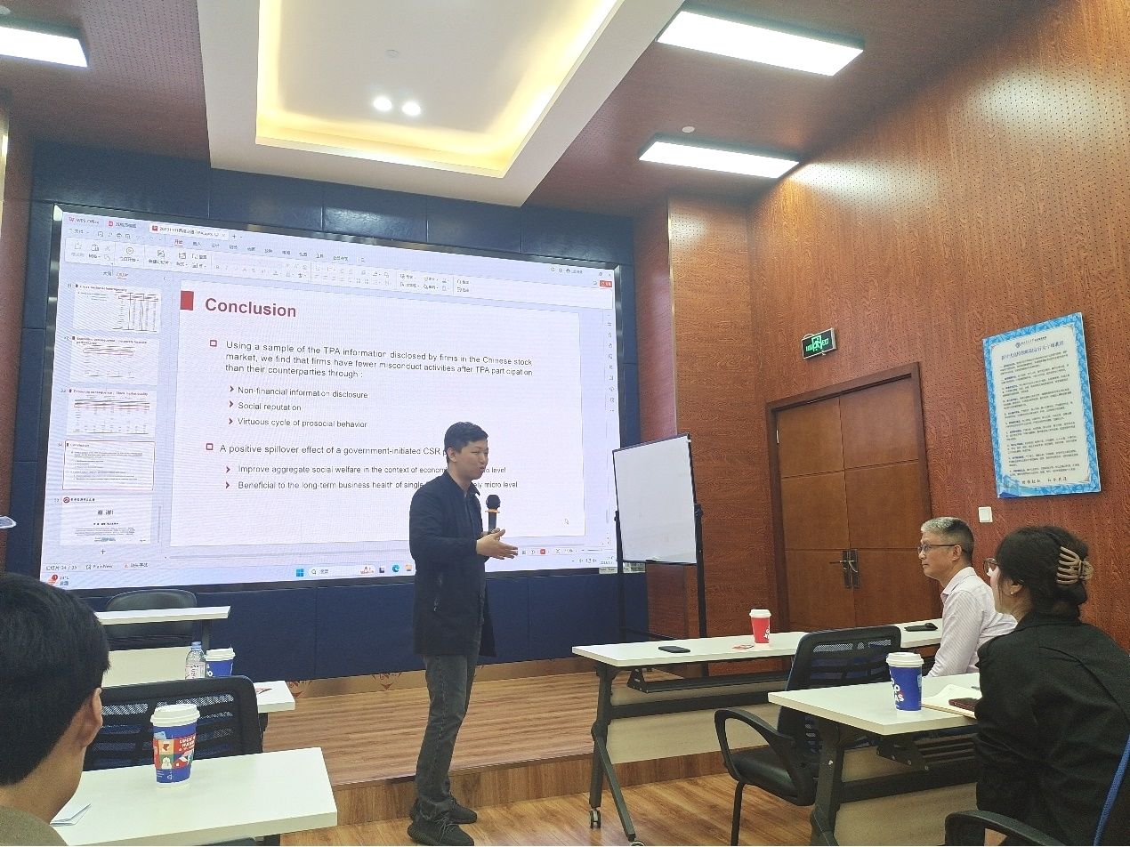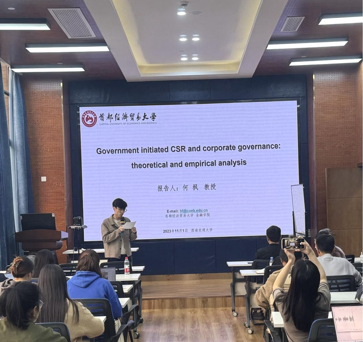 2023年11月1日下午15:00,首都经济贸易大学金融学院何枫教授应邀在九里校区0218室为开云官网师生作了一场题为“Government initiated CSR and corporate governance: theoretical and empirical analysis”的讲座。此次学术活动由学院金融与财务学系马锋副教授主持,学院部分教师以及研究生参加此次活动,马锋副教授对何枫教授的学术成果进行了介绍,同时对何教授的到来表示热烈的欢迎和感谢。