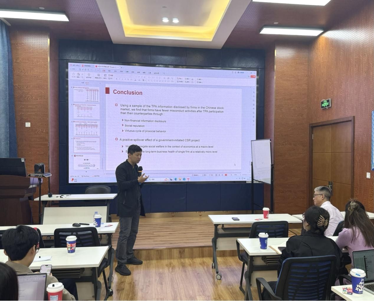 首先,何教授指出企业社会责任(CSR)和企业政治活动(CPA)都是重要的企业战略,引出了论文的研究内容:利用中国精准扶贫(TPA)计划的独特背景,研究政府发起的企业社会责任项目对公司治理的影响。然后何教授详细介绍了论文的实证发现:双重差分估计表明参与精准扶贫项目的企业相比同类公司拥有更好的财务表现,更少的公司违规事件,更低的崩盘风险和更好的创新表现。这一发现在平行趋势检验,安慰剂检验,替代回归,替代研究设计和反向因果关系分析中都是稳健的。