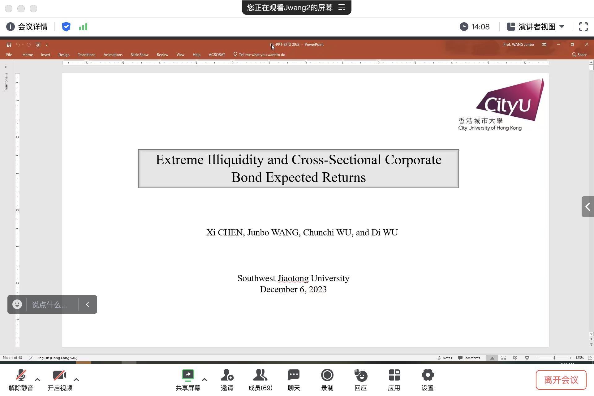 2023年12月6日上午9:00,香港城市大学经济与金融系王军波教授应邀在线上为开云官网师生作题为“Extreme Illiquidity and Cross-Sectional Corporate Bond Returns”的学术讲座。此次学术活动由学院金融与财务学系朱宏泉教授主持,朱宏泉教授对王军波教授的学术成果进行了介绍,学院副院长聂佳佳对王军波教授的分享表示热烈的欢迎与感谢。学院部分教师及博士生、研究生参加此次活动。