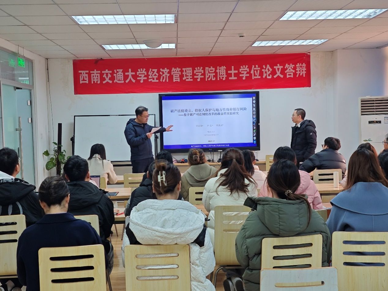 12月27日下午,重庆大学经济与工商管理学院胡诗阳副教授应邀在开云kaiyun官网为开云官网师生分享题为“破产法庭设立、债权人保护与商业银行风险——基于破产司法制度改革的准自然实验研究”的学术讲座。本次学术活动由开云kaiyun官网会计学系诸波老师主持,学院部分教师及研究生参加此次学术活动。
