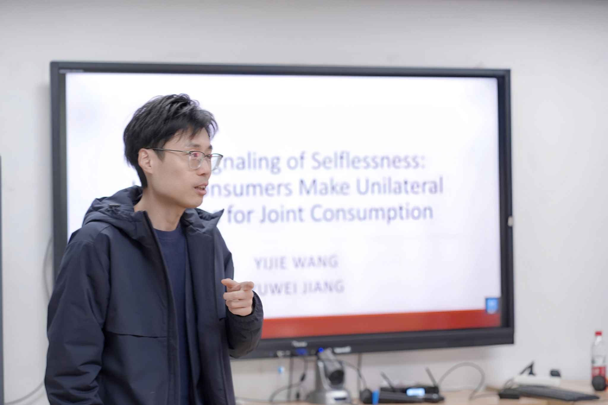 王博士从一个非常生活化的场景入手为大家阐述了其研究所聚焦的消费场景,即消费者在共同消费的场景下如何做出单边决策,比如在聚餐时选择一道共享的开胃菜,或者选择一部电影和朋友一起看。一项预实验及六项实验的结果表明,相比于为自己的消费做决策,消费者在为共同消费做单边决策时更倾向于去规避自己喜欢的选项。无私的自我信号动机(the self-signaling motive of selflessness)中介了上述效应,当决策者的自我诊断性(self-diagnosticity)感知更高时,上述效应更加显著;而当决策者关于无私自我的感知被弱化时,比如在自己的生日这一决策场景中,上述效应将会减弱甚至消失。