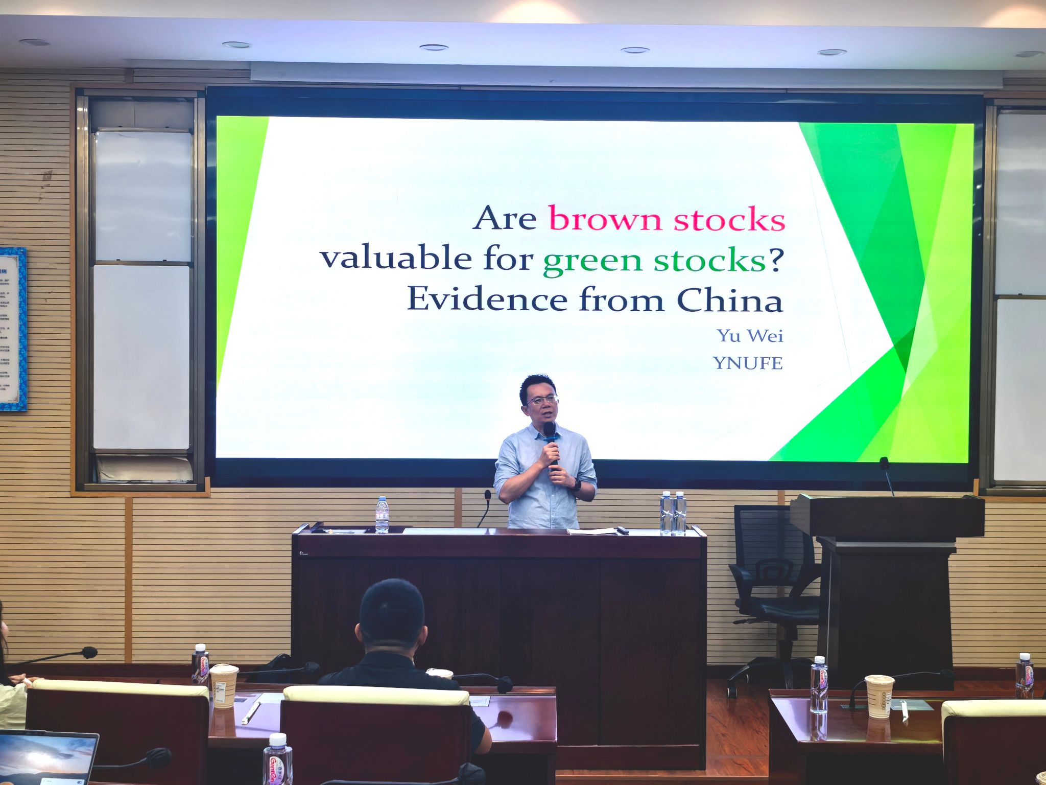 首先,魏宇教授以生活中的绿色金融概念为切入点,引出绿色股票的“双重收益”特性。然而,绿色股票的收益通常伴随较高波动性。随后,魏宇教授进一步介绍了棕色股票的定义,并指出此类公司多为商业模式成熟、收益稳定的传统行业企业,其价格波动相对稳健。在此背景下,魏宇教授指出,目前尚无充分的实证研究探讨绿色与棕色股票在投资组合中的分散化作用,这也正是本研究切入的关键所在。随后,魏宇教授从方法和数据、网络分析结果、分散化效应的强度等方面详细介绍了他的研究内容。