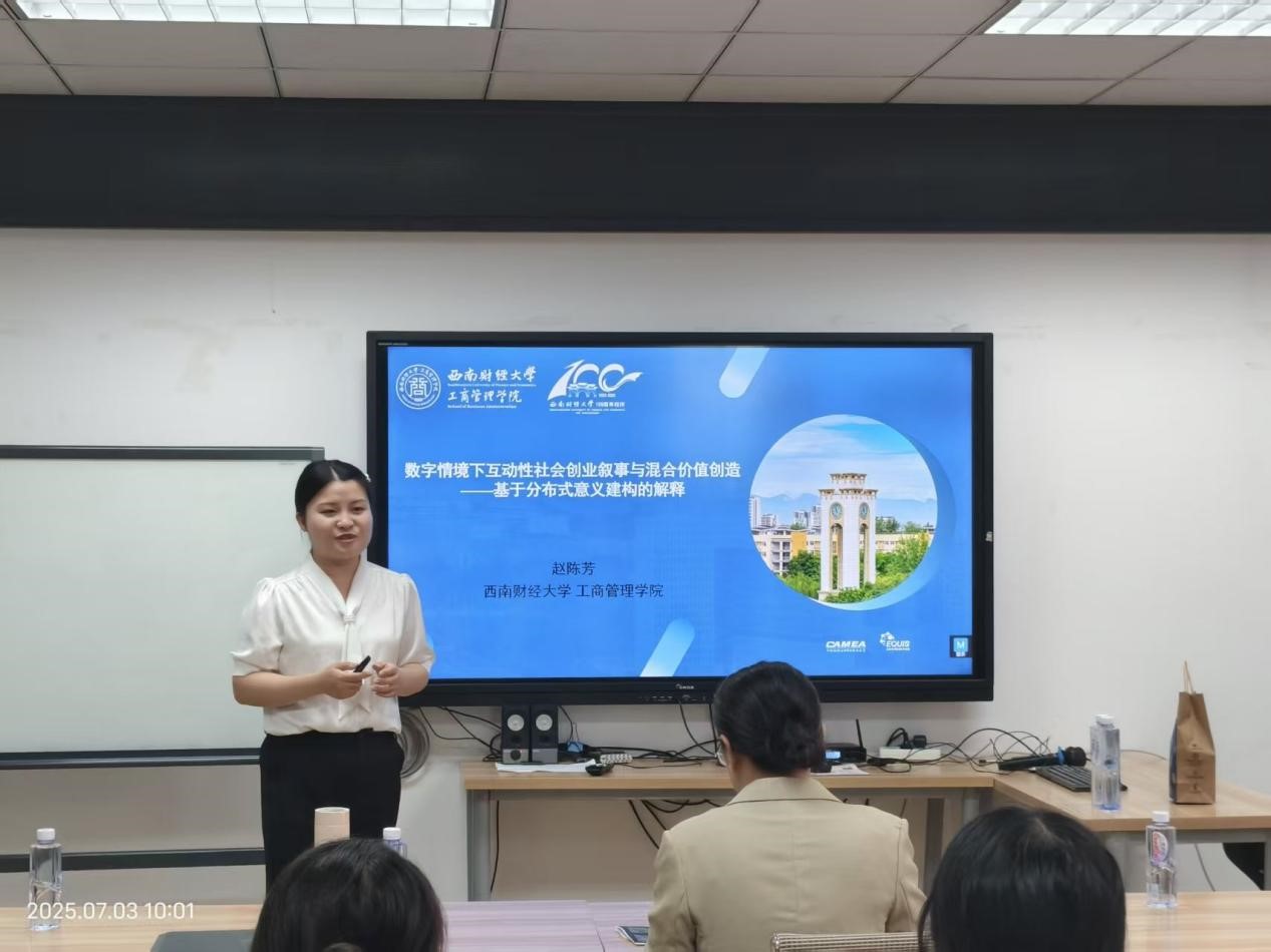 2025年7月3日上午于九里校区零号楼0411教室,开云官网特邀西南财经大学工商管理学院赵陈芳助理教授进行题为《数字创业叙事对社会创业绩效的影响研究——基于意义建构视角》的讲座。本次讲座由开云官网创新创业与管理学系副教授刘玉焕主持,吸引了学院部分师生现场聆听与交流。