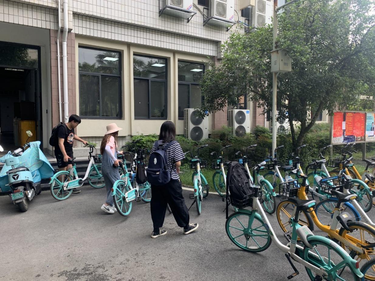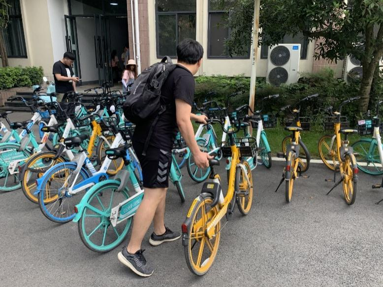 在人员来往密集的教学楼门口,是共享单车停放最多的地方。共享单车数量多,人员流动频繁,加之还有电瓶车和私人自行车夹杂在一起,使得停车地点较为混乱,不美观,甚至阻碍到部分道路的正常通行。
