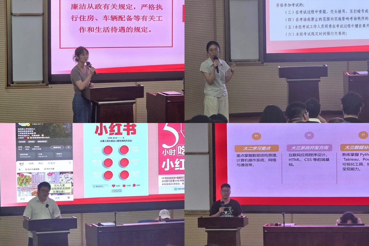 第四党支部副书记钟文婷同志带领全体党员系统学习规定内容,并结合典型案例展开警示教育。第三党支部副书记王重月同志领学《开云kaiyun官网本科生考试违规处理办法》,以制度条例和真实事例敲响纪律警钟。第三党支部党员刘芫硕同志结合自身经历,分享其在自媒体运营上从兴趣挖掘到内容创作的全过程。第四党支部党员杭麟奇同志则围绕自身技能提升与学习实践,推荐了一系列有助于提升专业能力和综合素质的技能。两位党员强调在学业与生活中要坚守纪律底线,以严谨的态度对待学习和实践。最后,支部全体成员庄严签订《诚信考试承诺书》。